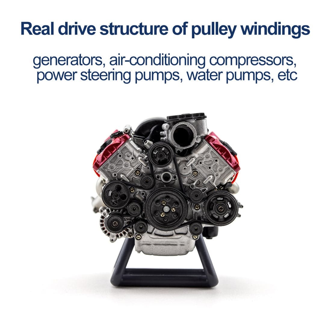 That’s why v8 engine is special. This mini plastic V8 scale model is a simulation of a real engine made by the brand MAD RC. No gasoline is used. it stimulates the internal combustion engine structural principle design, drive structure of belt wheel winding, generator, air conditioning compressor, steering pump, water pump, complete output flywheel and layered cylinder head, cylinder head cover, spiral near and far valve intake manifold, oil pan structure, and power supply drive board plug interface.