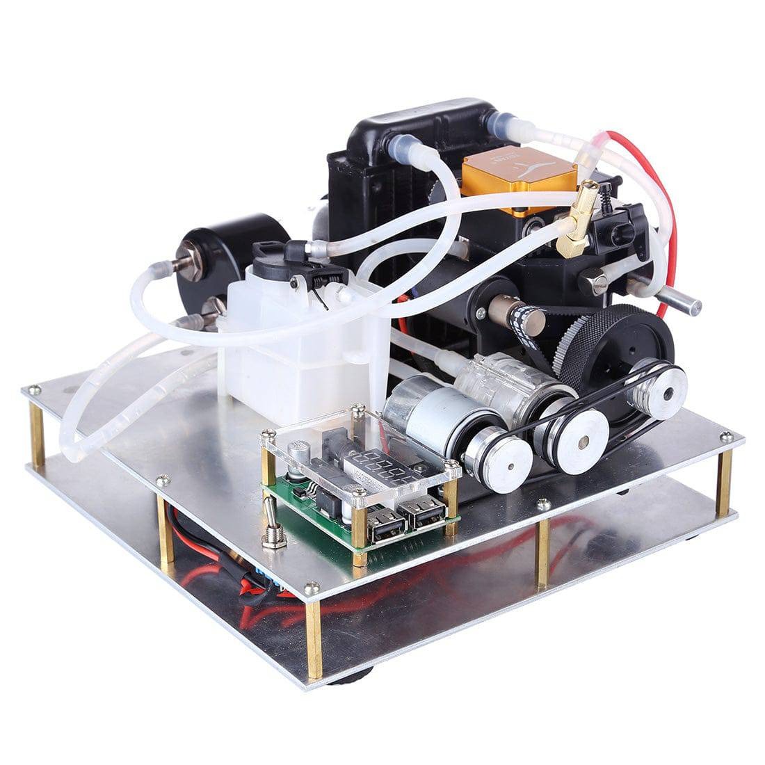 .This product is a modified self-made water-cooled generator model. The TOYAN single-cylinder four-stroke engine is changed to methanol/gasoline universal. It is used as the power of the generator. It has a heat pump such as a water pump and a radiator tank. It also has a thermometer to observe the temperature of the engine at any time. It protects the engine from damage caused by overheating. Comes with starter battery, charger and USB light. After assembling and debugging, the product can be shipped, and you only need to refuel and start it after simple debugging.